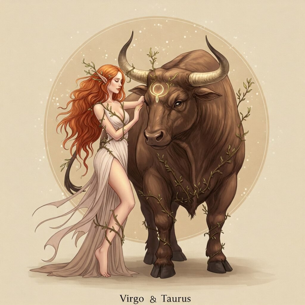 Съюзът се счита за хармоничен, защото тези партньори си изглеждат много надеждни един на друг. Изглеждат приятна и безпроблемна двойка. И двамата са предпазливи, пристъпват внимателно към връзките си, но с намерението да градят дългосрочни планове. И двамата не харесват показността, а предпочитат прикритата нежност. Щом спечелят доверието си, те се събират. Влюбването между тях рядко е бурно и драматично, но появи ли се симпатия- тя е основана на много добри перспективи за дълготрайна задружност и привързаност. Телецът и Девата обичат да планират. Очаква се да имат добро разбирателство по почти всички теми. И двата знака са практични и степента на реализация на плановете им вероятно ще бъде много висока. Телецът крачи бавно, предпазливо, но неотклонно и упорито.