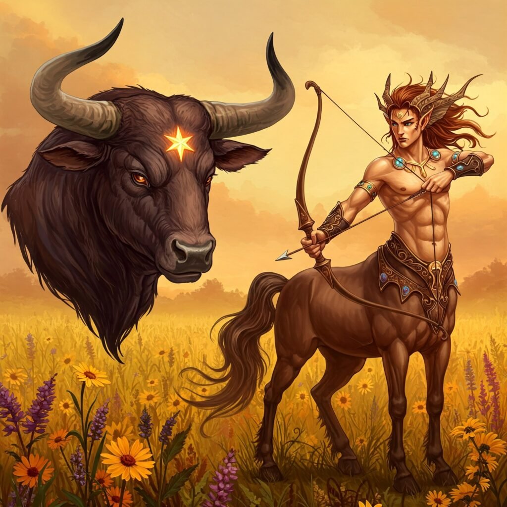 Това е едно от най- рядко срещаните партньорства, особено в продължителен план. При тях е възможна авантюра, но несходствата много ще затрудняват разбирателството и взаимността. Стрелецът е един от най- импулсивните знаци, пада си малко „кавгаджия“, особено от гледна точка на Телеца. Стрелецът просто казва и показва каквото му идва от вътре и с каквато емоция му дойде. Директният маниер на Стрелеца е добронамерен, но за натурата на Телеца, която е от най- подредените, всички тези кипящи състояния ще идват в повече.
