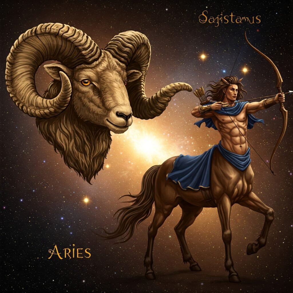 Почти навсякъде тази комбинация е описвана като „готови за сватба“. Среща се често. Почти всеки Стрелец някога е харесвяал Овен и обратно. При тази двойка е възможно искрата да пламне от пръв поглед, защото и двамата са нетърпеливи да вземат щастието си в ръце, искат всичко да е бързо и сега… Те могат да си влияят много добре във взаимното израстване. Стрелецът подхранва силата на Овена, поднася му възхищението си по присъщия за Стрелеца естествен, усмихнат, ободряващ начин. Стрелецът е готов да се включва в повечето от начинанията на Овена.